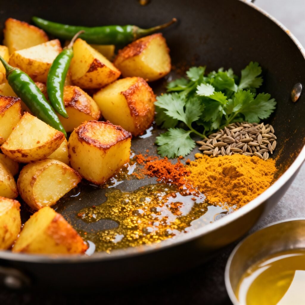 - Add the Potatoes: Add the cubed potatoes to the pan and mix well, ensuring they are coated with the spice mixture.