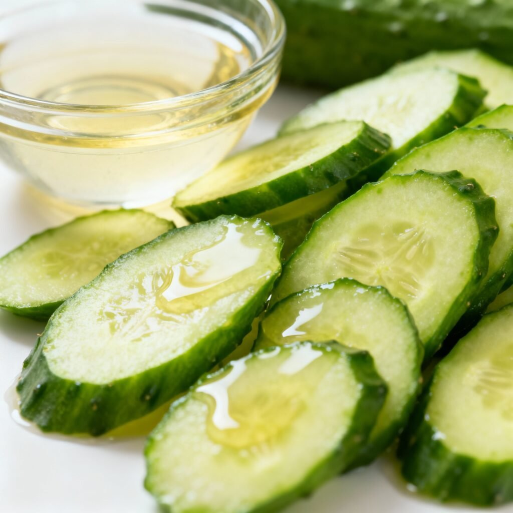 - Prepare the Cucumbers: Wash the cucumbers thoroughly. If using English cucumbers, you can leave the skin on. If using Persian cucumbers, you can peel them if desired. Slice the cucumbers thinly, about 1/8 inch thick. You can use a mandoline for consistent thickness, but a sharp knife works just as well.