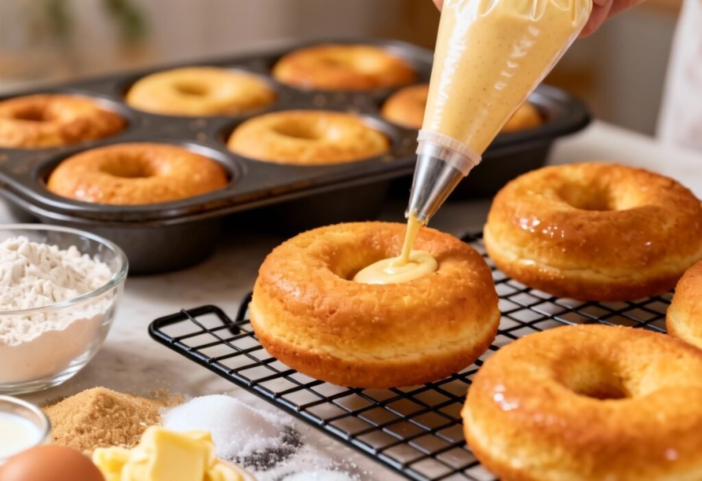 - Fill the Donut Pan: Transfer the batter to a piping bag or a large zip-top bag. If using a zip-top bag, snip off one corner. Pipe the batter into the prepared donut pan, filling each cavity about ¾ full.