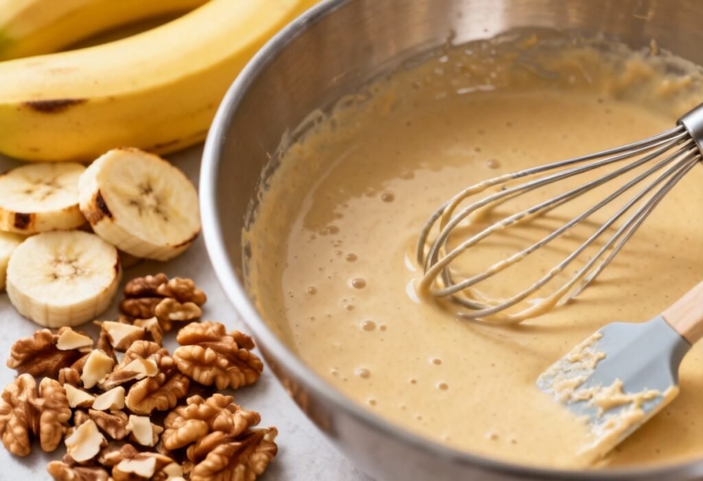 7. Fold in Bananas and Walnuts: Gently fold in the mashed bananas and toasted walnuts until evenly distributed.