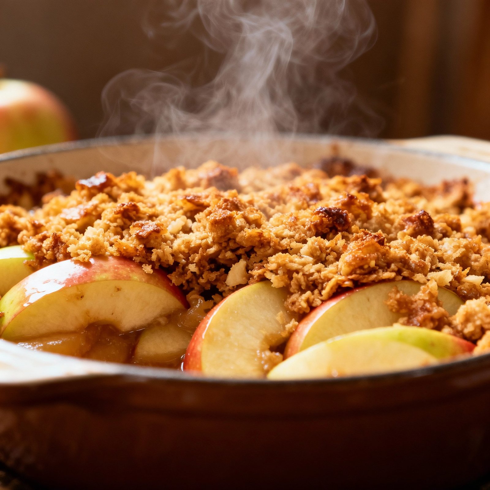 - The Baking Temperature: Starting at a higher temperature helps the topping crisp up quickly, while lowering the temperature ensures the apples cook through without burning the topping.