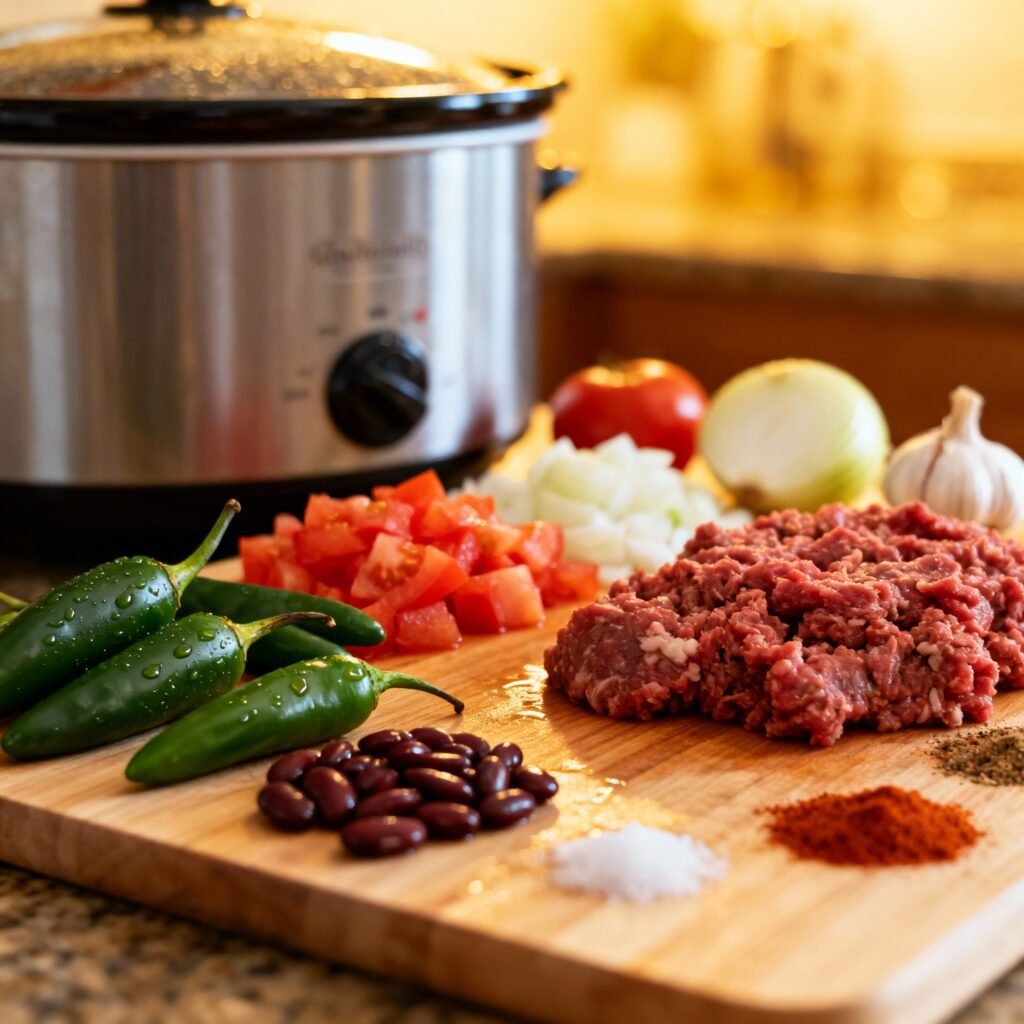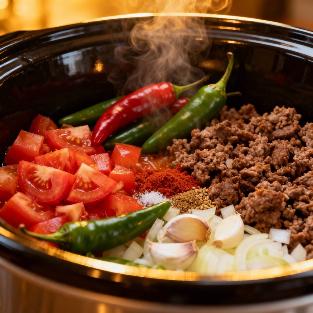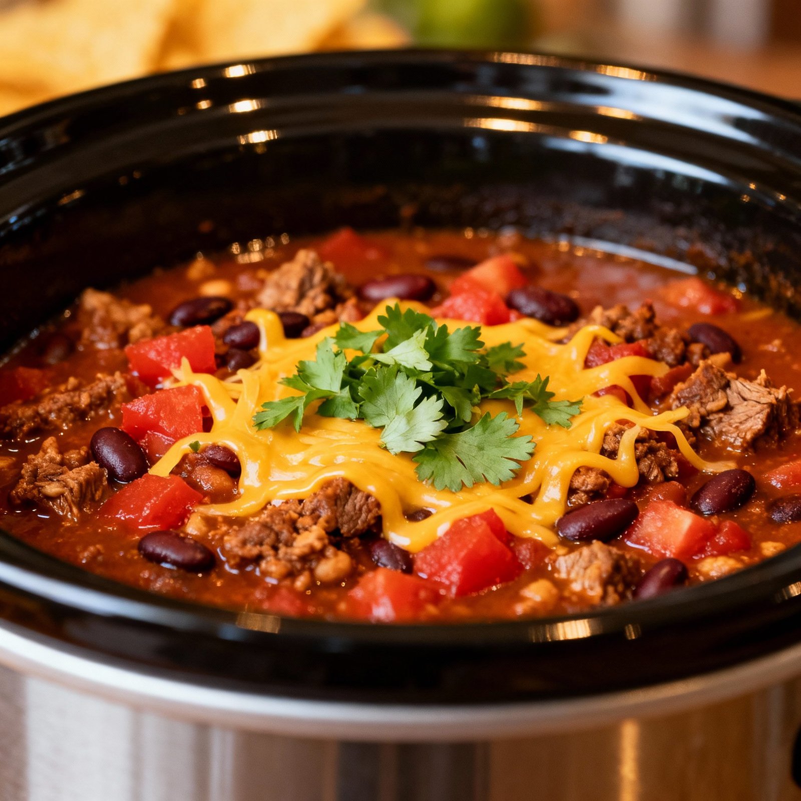 What if I don’t have a crockpot? You can also make this chili on the stovetop. Simmer it over low heat for at least 1-2 hours, or until the beef is tender and the flavors have melded together.