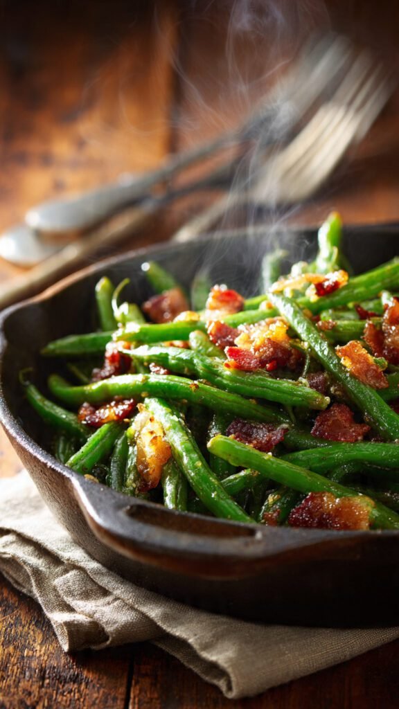 2. Can I make this ahead of time? You can blanch the beans ahead of time, but this recipe is best served fresh from the pan. If you reheat them, they lose that crispy “blister” and the bacon gets chewy. If you must, reheat them in a skillet or air fryer, not the microwave (the microwave is where texture goes to die).