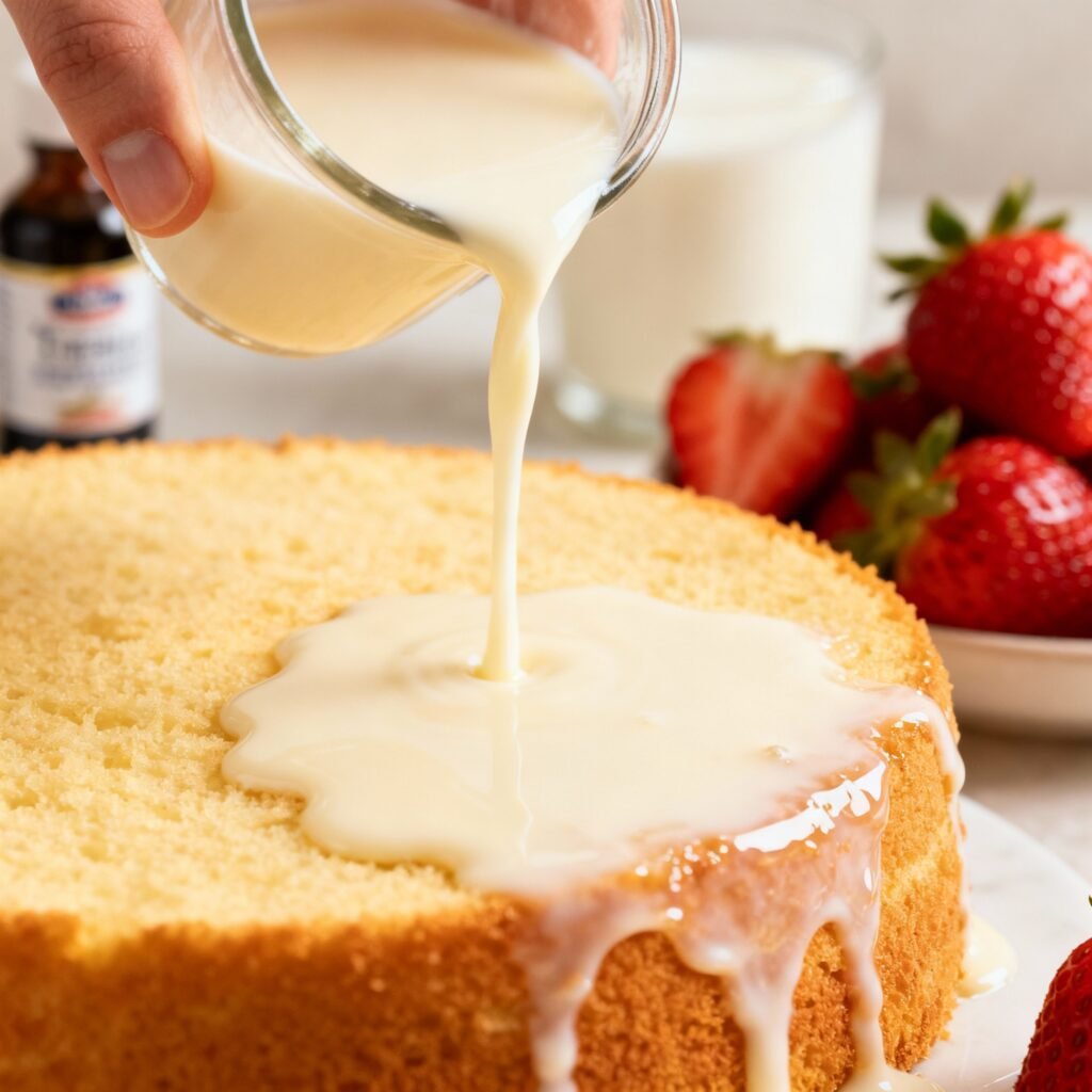 • The Sponge Cake Base: We opt for a light and airy sponge cake, made with whipped egg whites for incredible volume and a delicate crumb. This allows it to absorb the milk mixture without becoming dense or gummy.