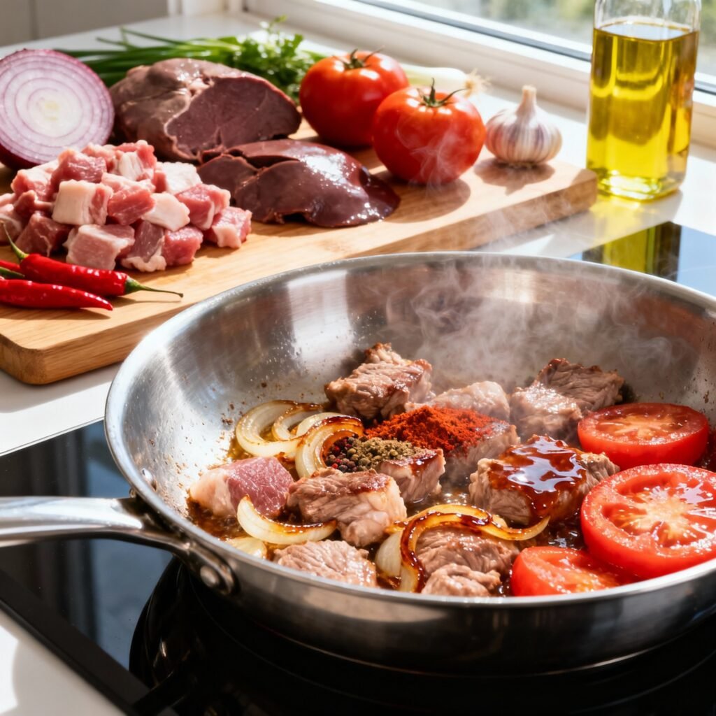 6. Add the Offal: Add the diced pork lungs and heart to the pan and stir-fry for about 5-7 minutes, until lightly browned.