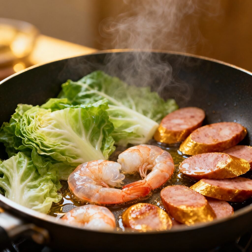 - Add the Shrimp and Sausage: Return the cooked sausage to the skillet. Add the shrimp to the skillet and stir to combine with the cabbage and sausage.