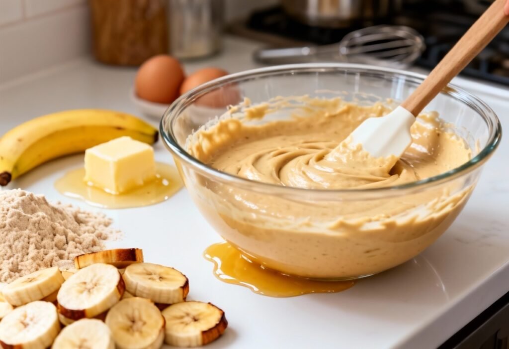 - Combine Wet Ingredients: In a large bowl, mash the ripe bananas until smooth. Add the vegetable oil, eggs, and milk. Whisk together until well combined.