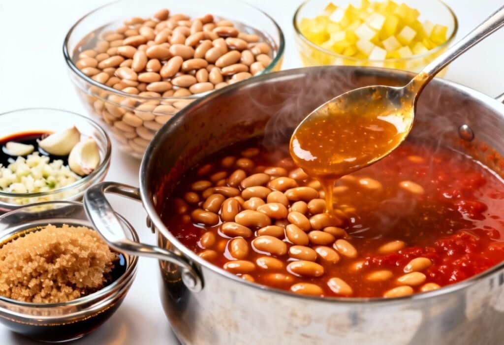 - Combine Ingredients: In a large bowl, combine the cooked beans, cooked bacon, sautéed onion, brown sugar, molasses, apple cider vinegar, mustard, salt, and pepper. Mix well to ensure all ingredients are evenly distributed.
