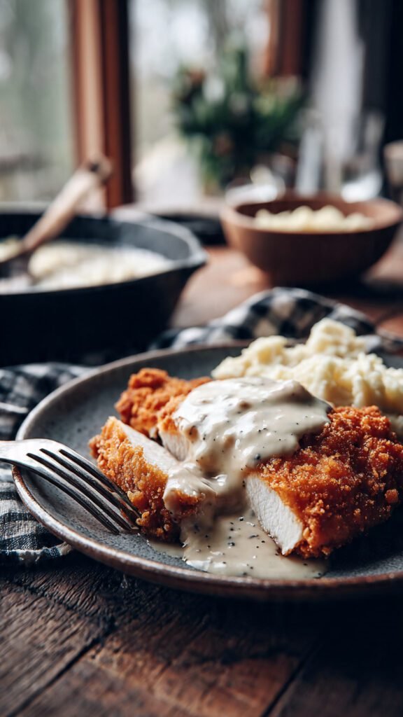 Slowly—I mean slowly—pour in the milk while whisking like a maniac. If you dump the milk in all at once, you’ll get lumpy gravy. Whisk until smooth. Bring it to a gentle simmer; it will thicken as it bubbles. Season heavily with salt and LOTS of black pepper. If it’s too thick, add a splash more milk. Serve immediately over that glorious crispy chicken.