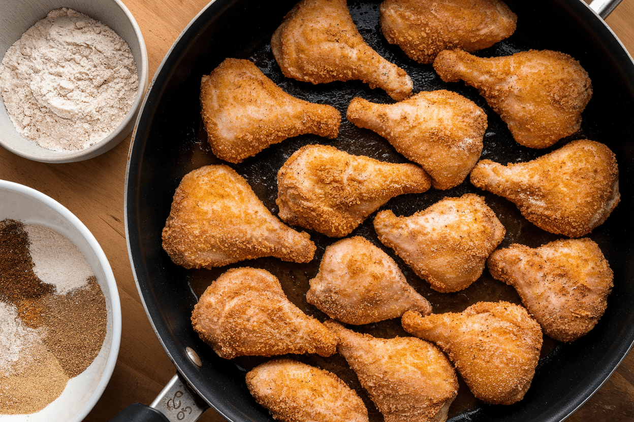 - Oven-“fried” approach: Toss dredged chicken in 2–3 tablespoons oil. Bake on a rack at 425°F for 35–45 minutes, flipping once. Not identical, but surprisingly crisp.