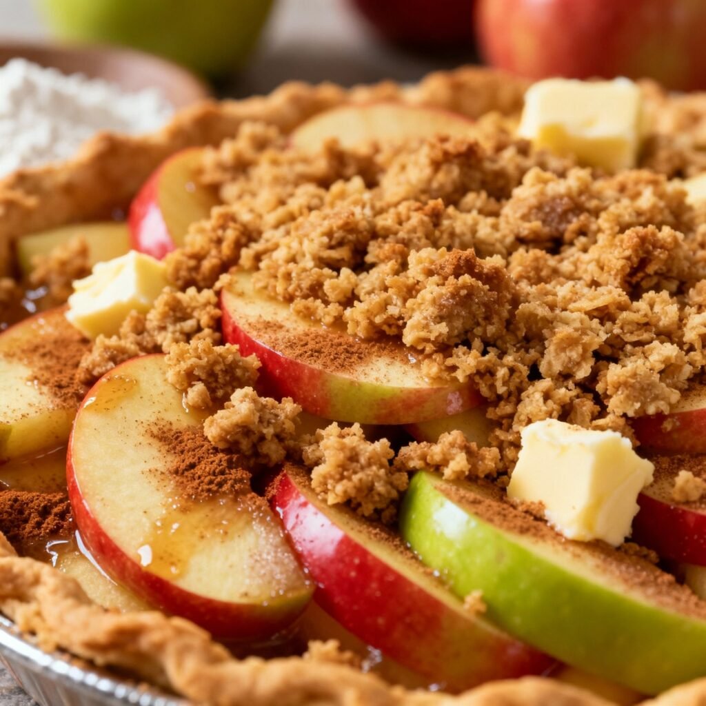 - Add the Crumb Topping: Sprinkle the crumb topping evenly over the apple filling, making sure to cover the entire surface.