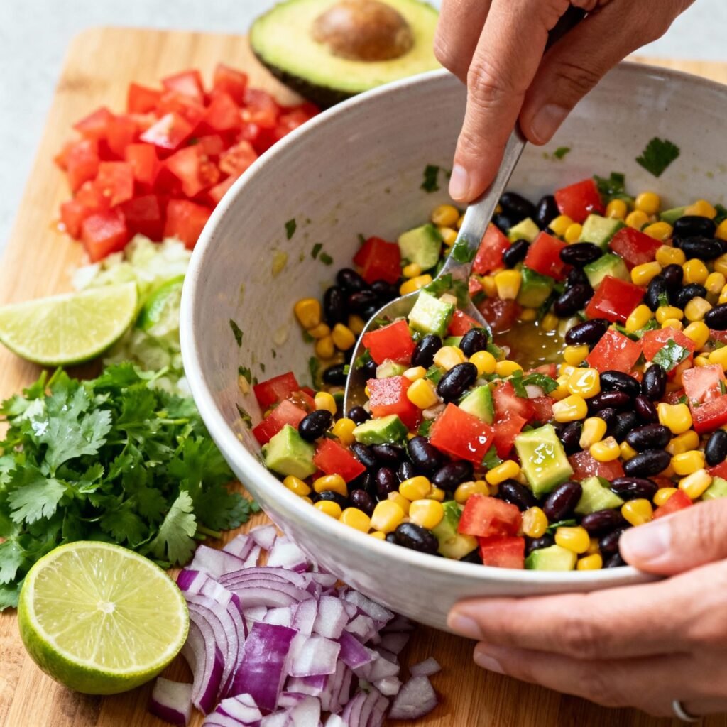 2. Combine the Ingredients: In a large bowl, combine the rinsed and drained black beans, black-eyed peas, and corn. Add the diced bell peppers, red onion, and jalapeño (if using).