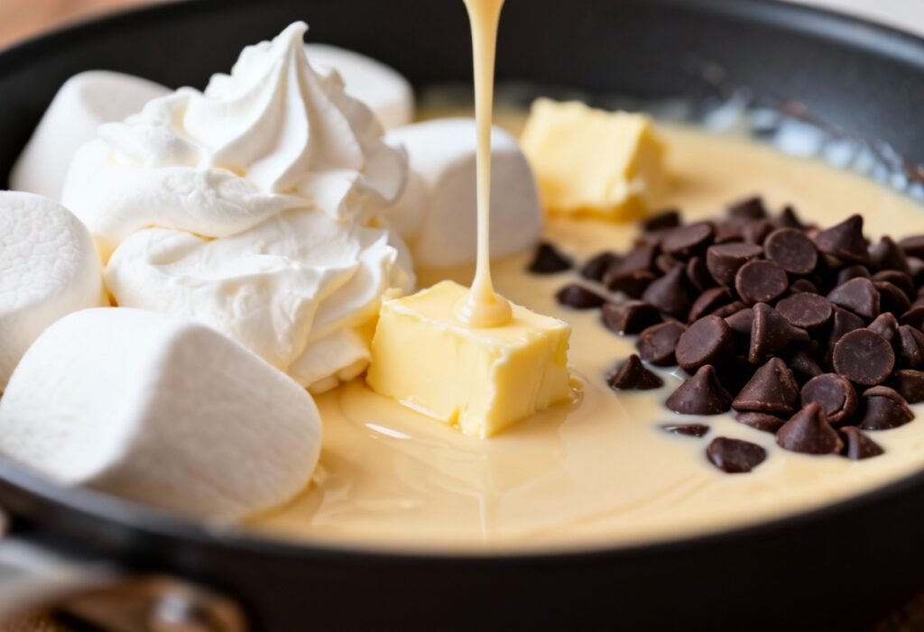 - Add the Marshmallow Fluff: Once the chocolate is melted, immediately add the marshmallow fluff, vanilla extract, and salt.