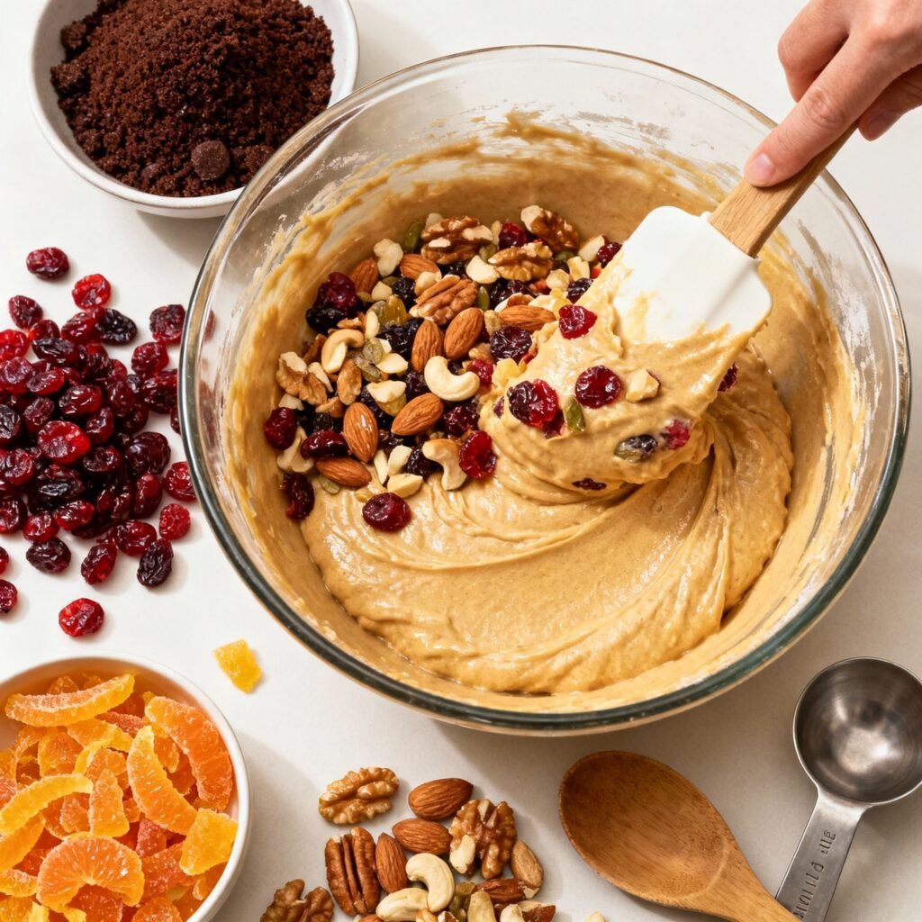 - Add Fruit and Molasses: Stir in the soaked fruit and nuts, along with the orange zest and molasses. Make sure the fruit is evenly distributed throughout the batter.