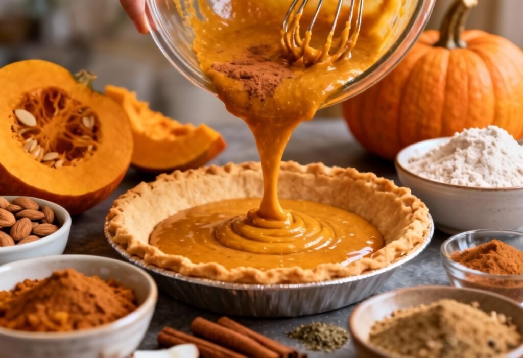 - Pour Filling into Crust: Pour the pumpkin pie filling into the pre-baked pie crust.