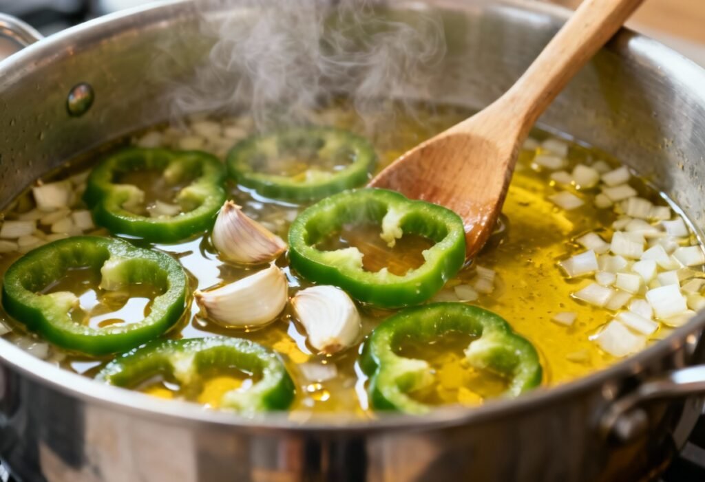 3. Combine and Simmer: Add the roasted green peppers to the pot with the onions and garlic. Pour in the vegetable broth (or chicken broth). Bring the mixture to a boil, then reduce the heat and simmer for 15 minutes to allow the flavors to meld.