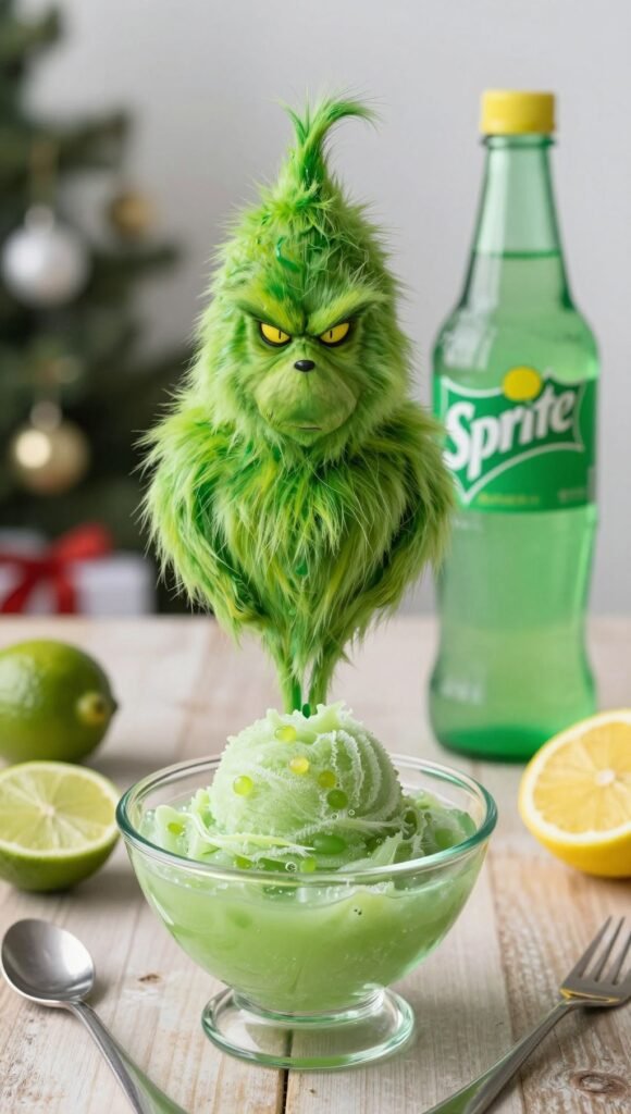 - Scoop the sherbet. Add generous scoops of lime sherbet on top. It will float, foam, and create that creamy, frothy Grinch-y look.