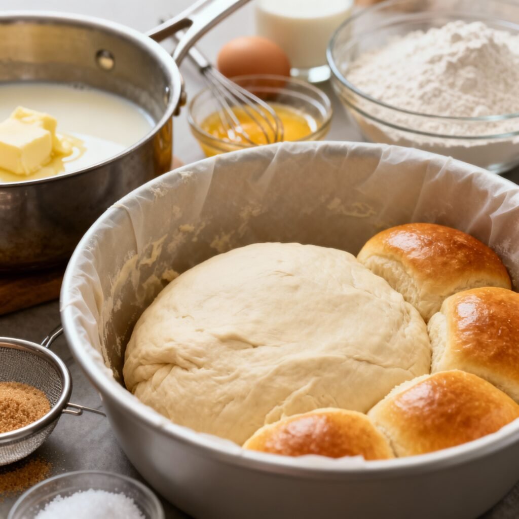 - Shape the Rolls: Gently punch down the dough to release the air. Turn the dough out onto a lightly floured surface. Divide the dough into 12 equal pieces (or more, depending on the size you want). Roll each piece into a ball and place them in a greased 9×13 inch baking dish.