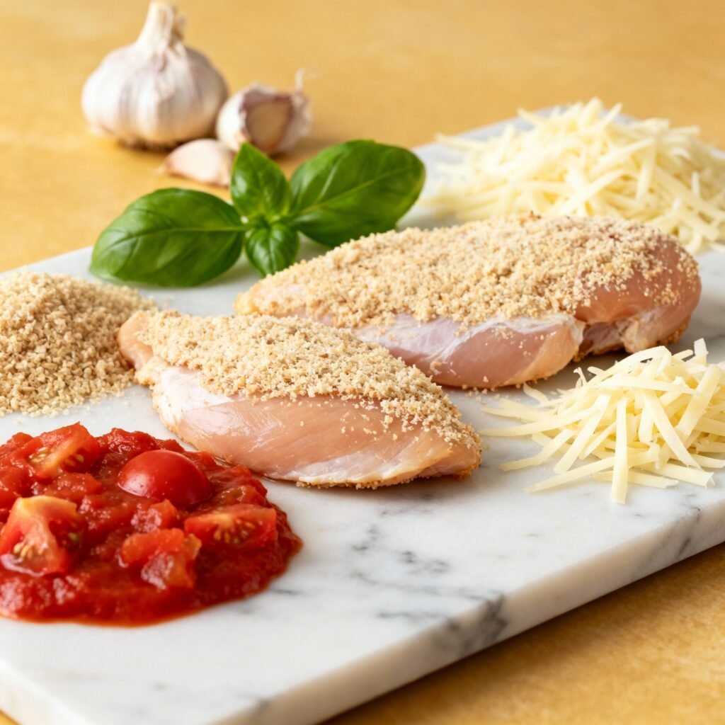 - Assemble and Bake: Once the chicken is cooked, remove it from the oven. Spread a thin layer of marinara sauce on each chicken cutlet. Top with the shredded mozzarella cheese and the remaining 1/4 cup of Parmesan cheese.