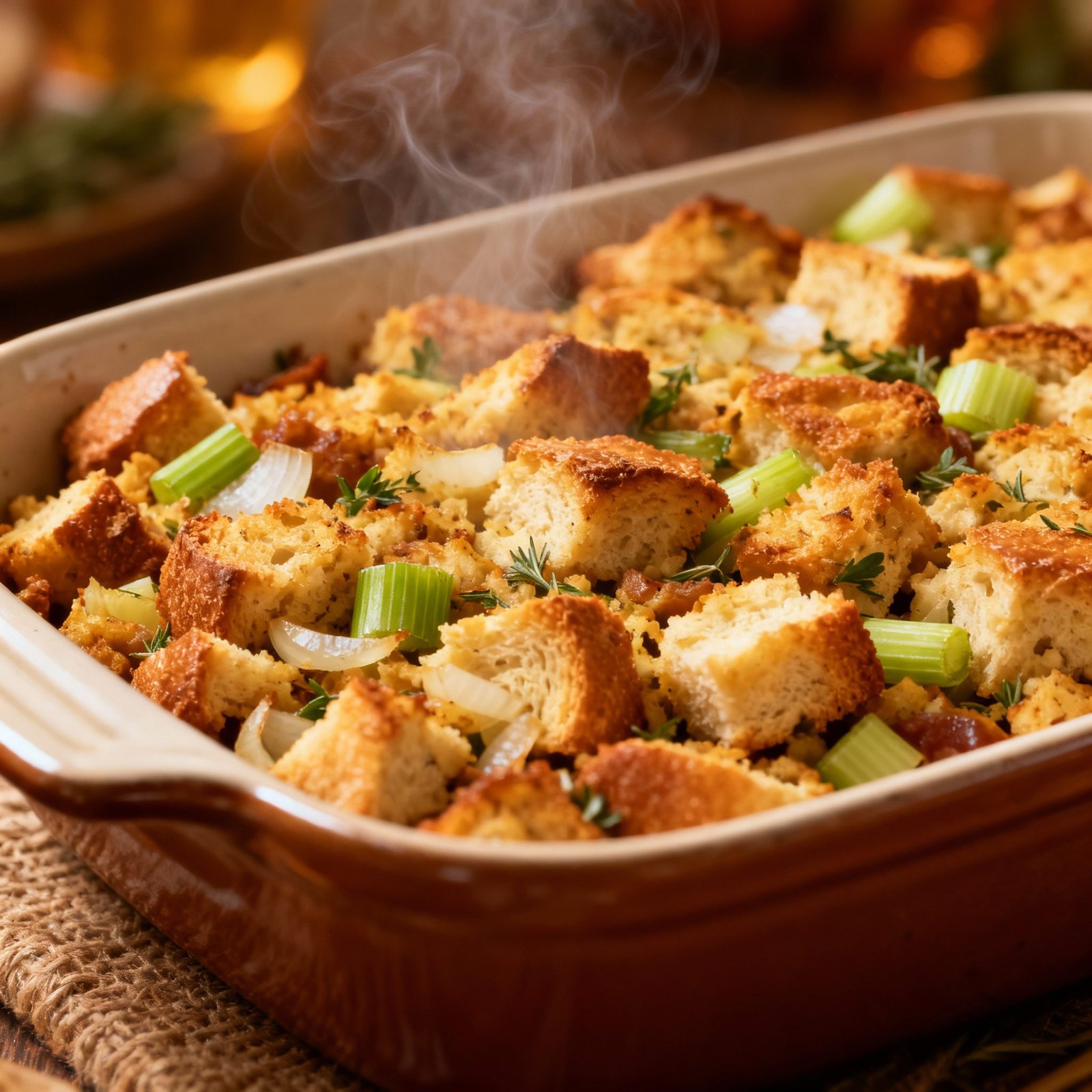 - Bake the Stuffing: Preheat oven to 350°F (175°C). Transfer the stuffing to a lightly greased 9×13 inch baking dish.