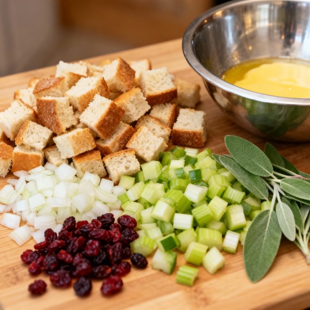 - Prepare the Bread: Preheat oven to 300°F (150°C). Spread the bread cubes in a single layer on a baking sheet. Bake for 15-20 minutes, or until lightly toasted and dried. This helps prevent the stuffing from becoming mushy. Let cool slightly.
