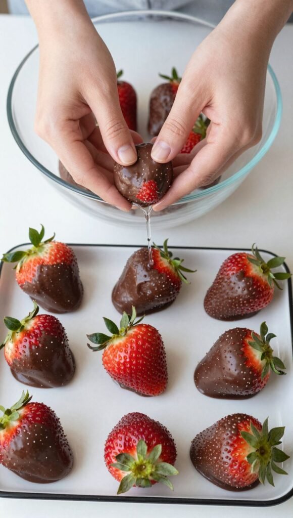 - Add Toppings (If Desired):If you’re adding toppings, do so immediately after dipping, while the chocolate is still wet. Gently roll the chocolate-covered portion of the strawberry into your chosen toppings, or sprinkle them over. For drizzling, wait until the first chocolate layer is set, then use a spoon or a piping bag with a very small hole to drizzle contrasting melted chocolate over the set berries.