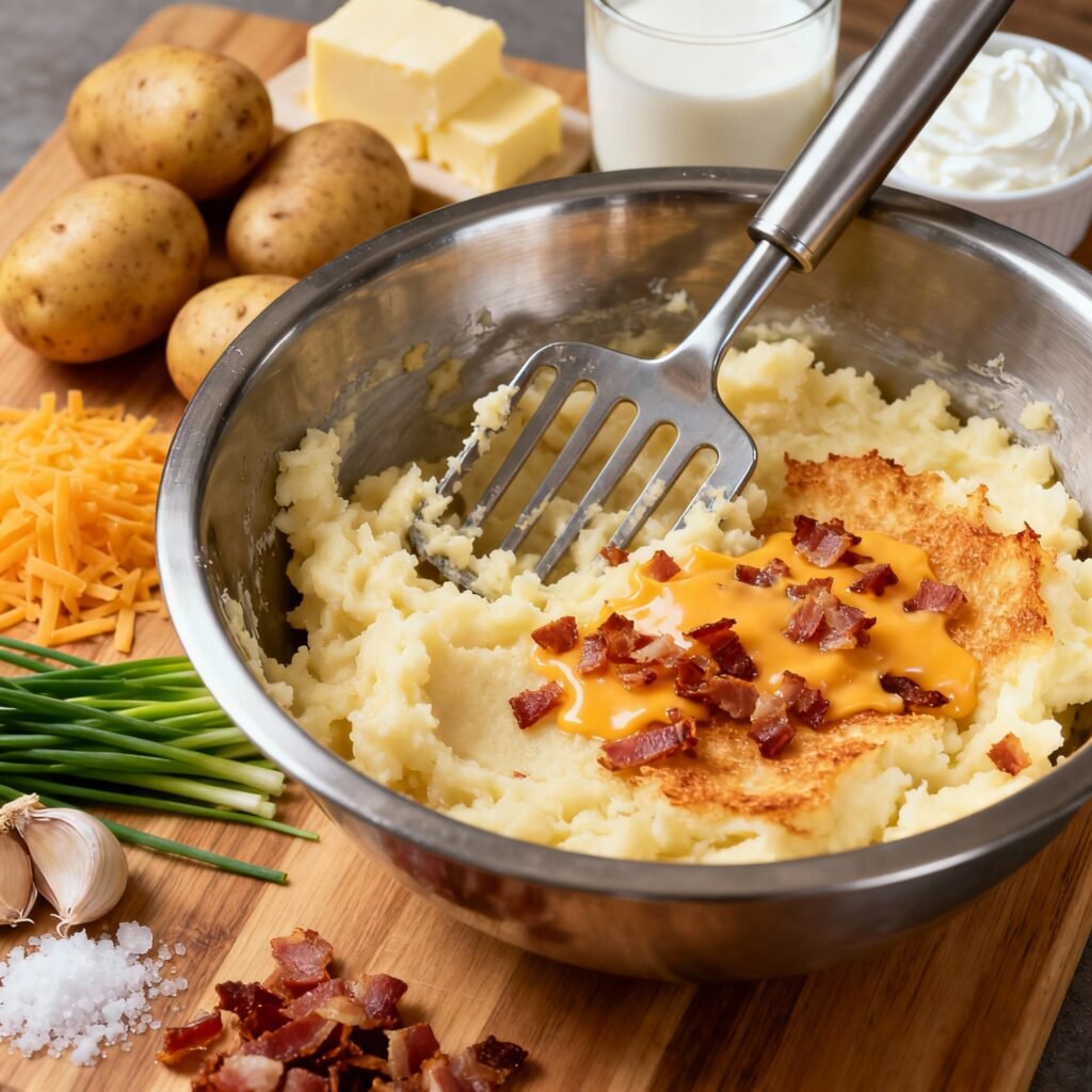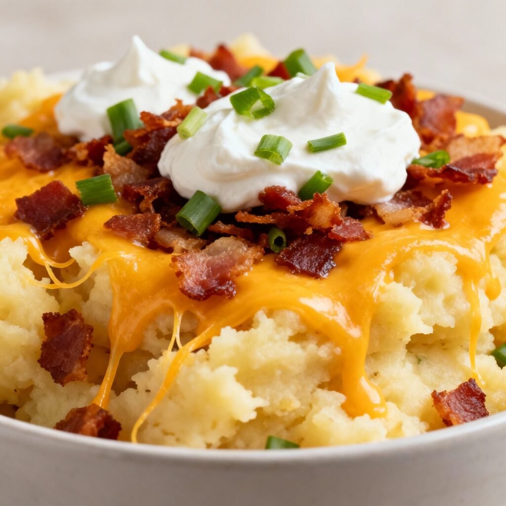 - Garnish: Transfer the loaded mashed potatoes to a serving dish. Top with the remaining shredded cheddar cheese, crumbled bacon, and chopped fresh chives.