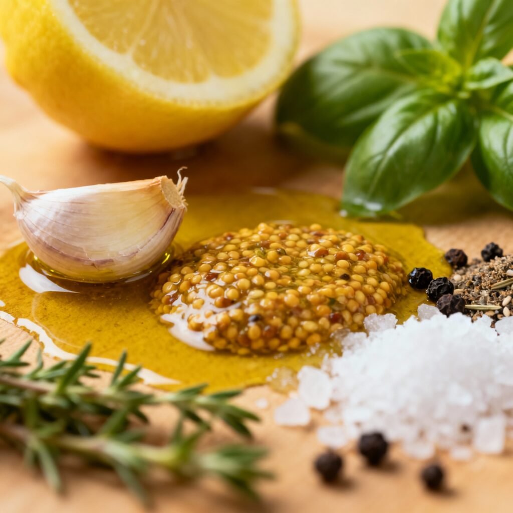 - Dijon Mustard: 1 teaspoon. Dijon mustard acts as an emulsifier, helping the oil and vinegar to combine and create a smooth, creamy dressing. It also adds a subtle tanginess.