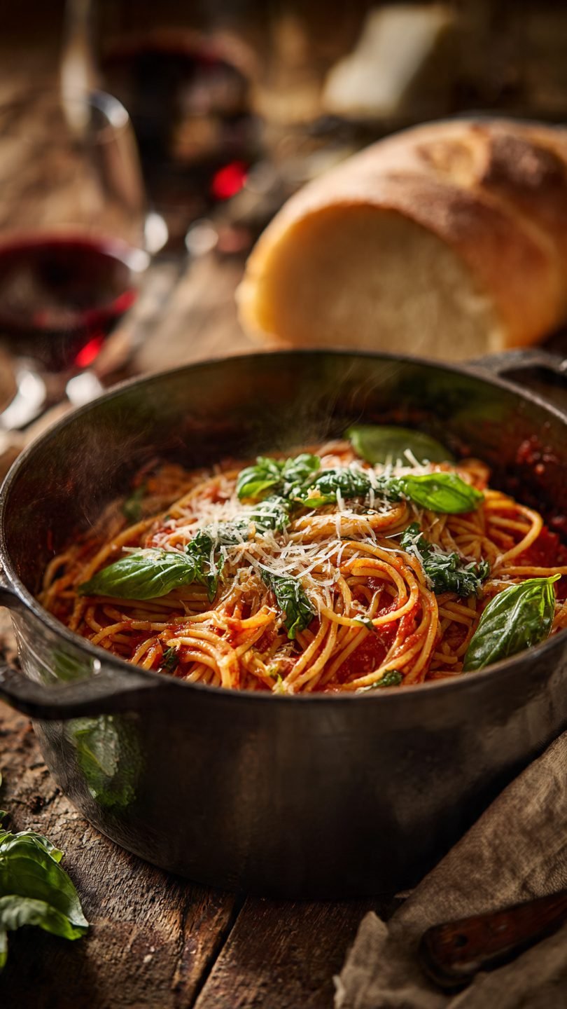 The Science of the Starch When you boil pasta the traditional way, you pour liters of salty, starchy water down the drain. That water is actually liquid gold. In the culinary world, starch is an emulsifier. By cooking the spaghetti directly in the tomato sauce and broth, the starch that leaches out of the pasta stays in the pot. It binds with the liquids and the fat (olive oil) to create a sauce that is naturally creamy, glossy, and clings to the noodles like a stage 5 clinger. It creates a texture you simply cannot replicate by boiling noodles separately.