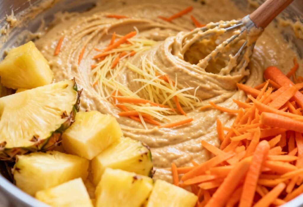 - Add Carrots and Pineapple: Fold in the grated carrots and crushed pineapple (with its juice). If using, fold in the chopped nuts.