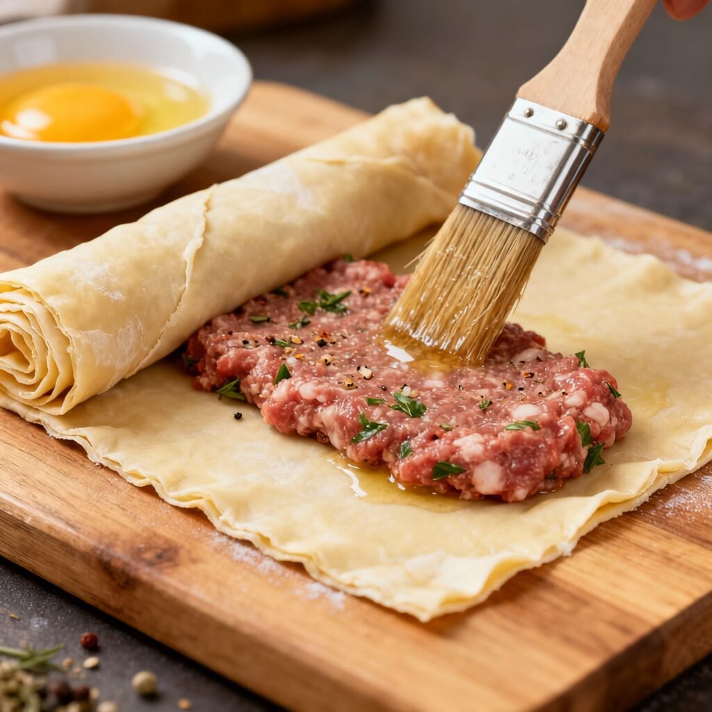 - Roll and Seal: Carefully roll the pastry over the sausage meat, encasing it completely. Press the edges of the pastry together firmly to seal, using a little water if necessary to help them stick. Repeat with the remaining sausage meat and pastry.