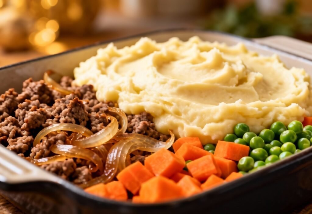 - Assemble the Shepherd’s Pie: Preheat oven to 375°F (190°C). Pour the beef filling into a 9×13 inch baking dish.