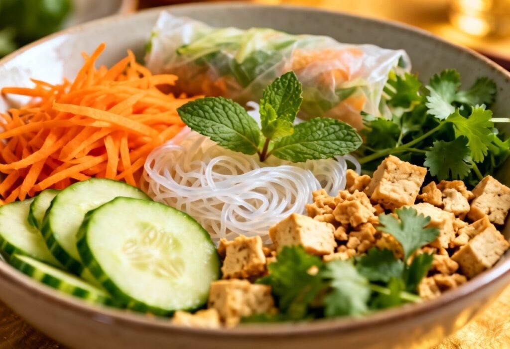 - Prepare the Vegetables: Wash and chop all the vegetables. Shred the carrots and cabbage, slice the cucumber thinly, and chop the herbs and green onions.