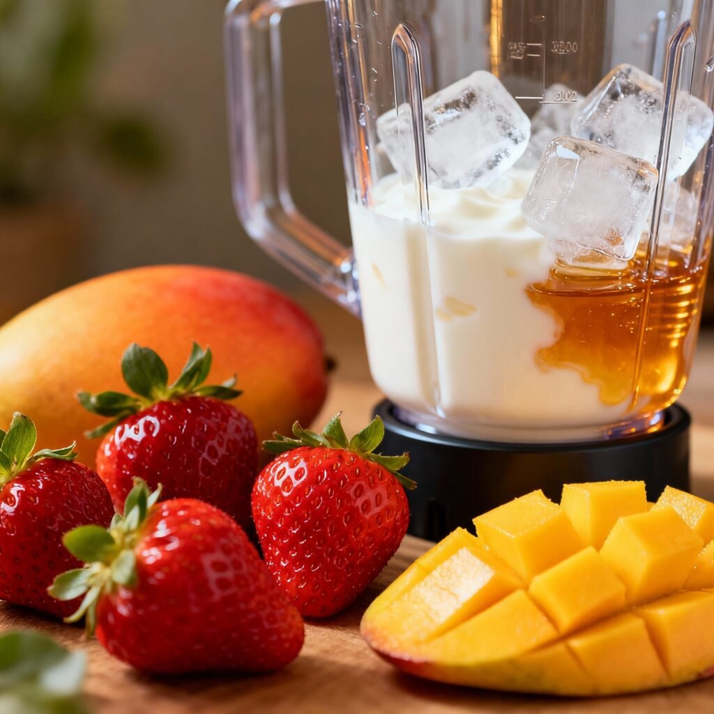 - Combine Ingredients in Blender: Add the frozen mango, frozen strawberries, Greek yogurt, and milk to a blender.