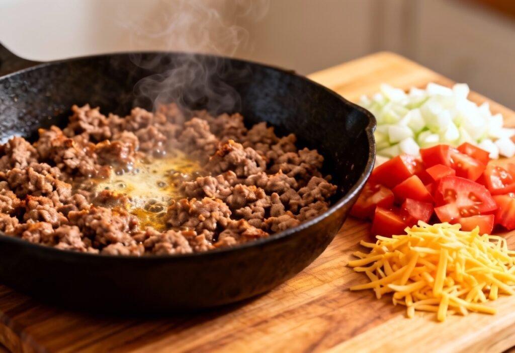 - Brown the Beef: In a large skillet or pot, brown the ground beef over medium-high heat. Break it up with a spoon or spatula as it cooks. Drain off any excess grease.