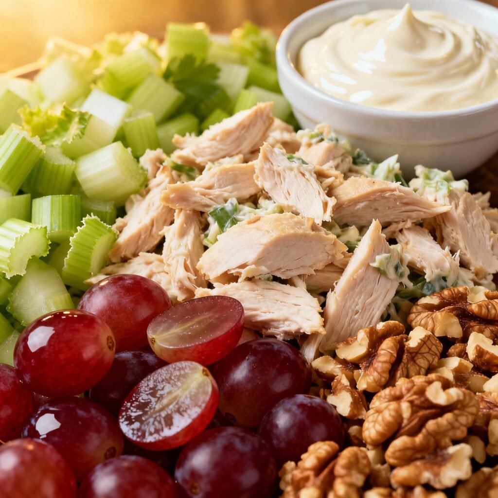 - Combine Ingredients: In a large bowl, combine the shredded or diced chicken, diced celery, and diced red onion.