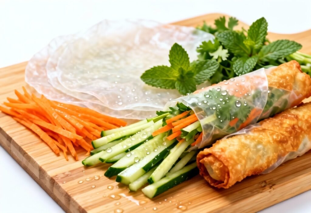 - Assemble the Spring Roll: Lay the softened rice paper wrapper on a clean, flat surface. Place a small amount of each vegetable (carrots, cabbage, bell pepper, bean sprouts, cucumber), rice noodles, mint, and cilantro in the center of the wrapper, leaving about 1 inch of space on all sides.